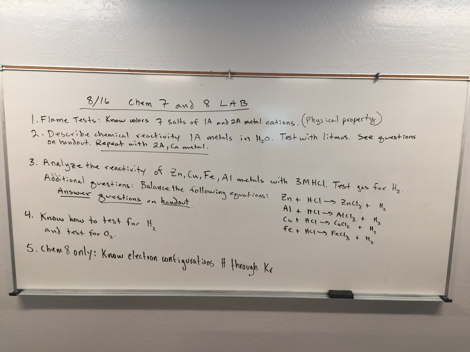 Week 8/14 through 8/18 Laboratory on Physical and Chemical Properties of elements and salts of elements. Flame Testing; Reactivity 1A and 2A metals with water; Reactivity of transition metals with HCl solution; Learning the test for hydrogen gas and oxygen gas. Lab Handout: physical and chemical states lab