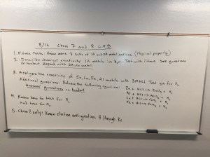 1) Make sure you can balance the four chemical equations on the white board. 2) Know the test for hydrogen and the test for oxygen and be able to perform the tests on demand successfully. 3) Answer all the questions on lab handout. 4) Watch the following videos by Thursday, Aug. 24. See Link: Atoms; watch video; See Link Electron Configuration, Orbital Diagrams, PES and watch Electron Configuration Basics 1.