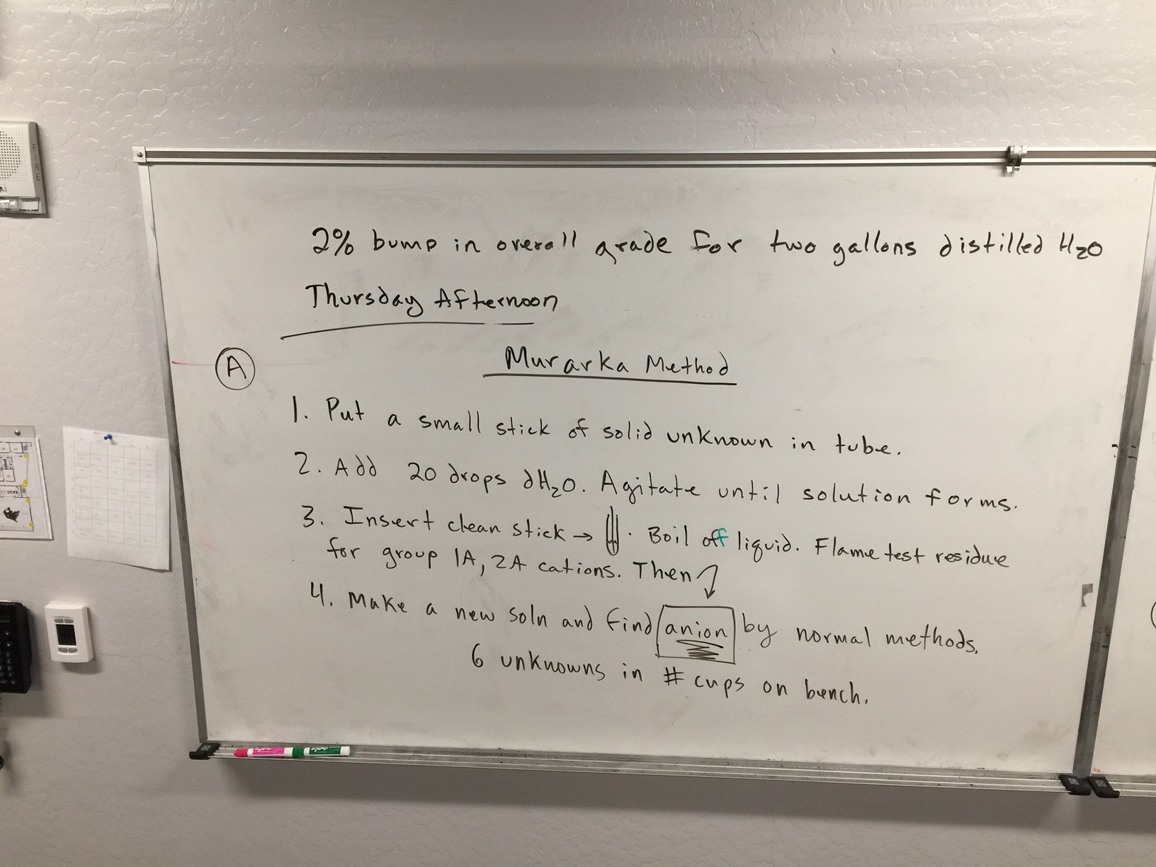 Wednesday, 10-4-17: Graded Lab on Thursday. Murarka Method, easy anions, cations, and nitrates. On the graded lab there will be 5 naming questions.